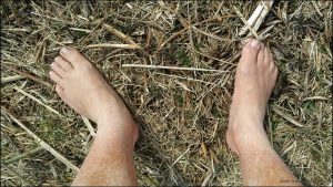 Boden des Feldrands am Eulenbach, auf diesen Stroh läuft es sich ganz angenehm, auch wenn der Teil der Sohle strapaziert wird, der sonst nie den Boden berührt.