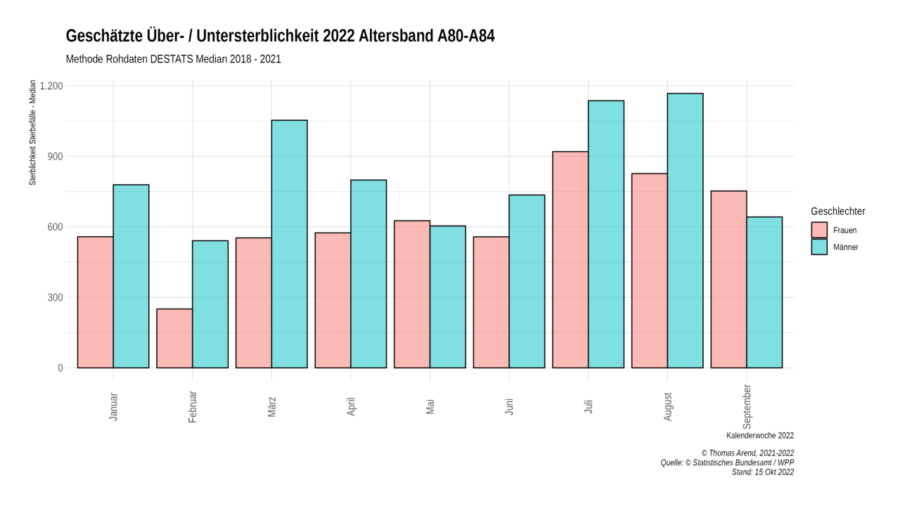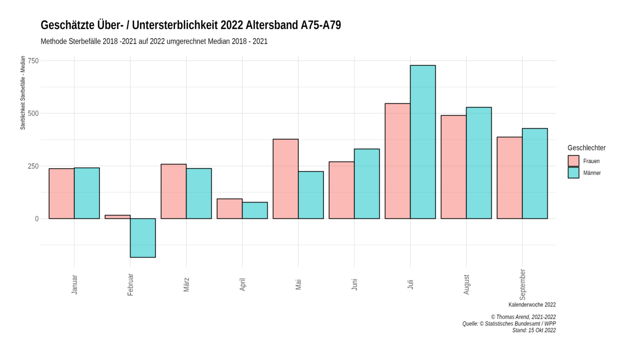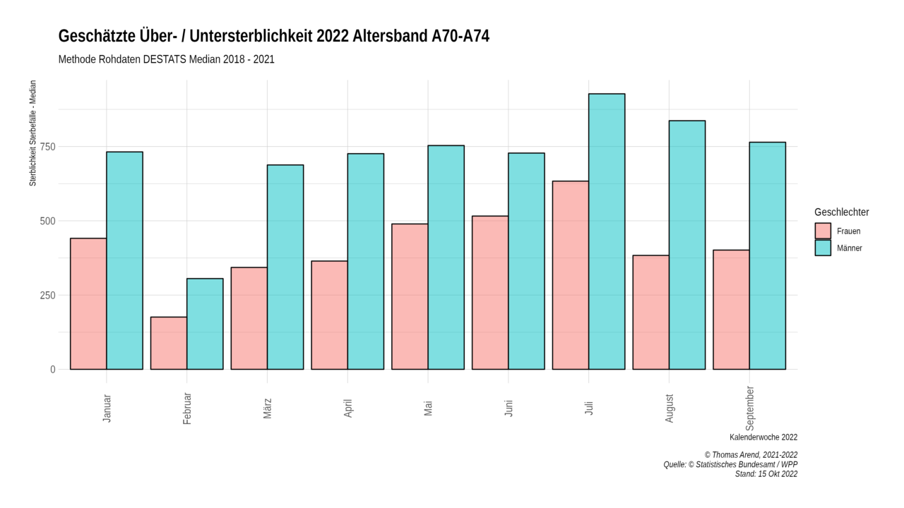 Das obige Diagramm zeigt die Über- / Untersterblichkeit der Monate Juli bis August 2022. Summiert man die Mediane der Altersbänder und die Gestorbenen auf, so ergibt sich für Juli eine Übersterblichkeit von 12, 6 %, August 11,2 % und September 9,1 %.